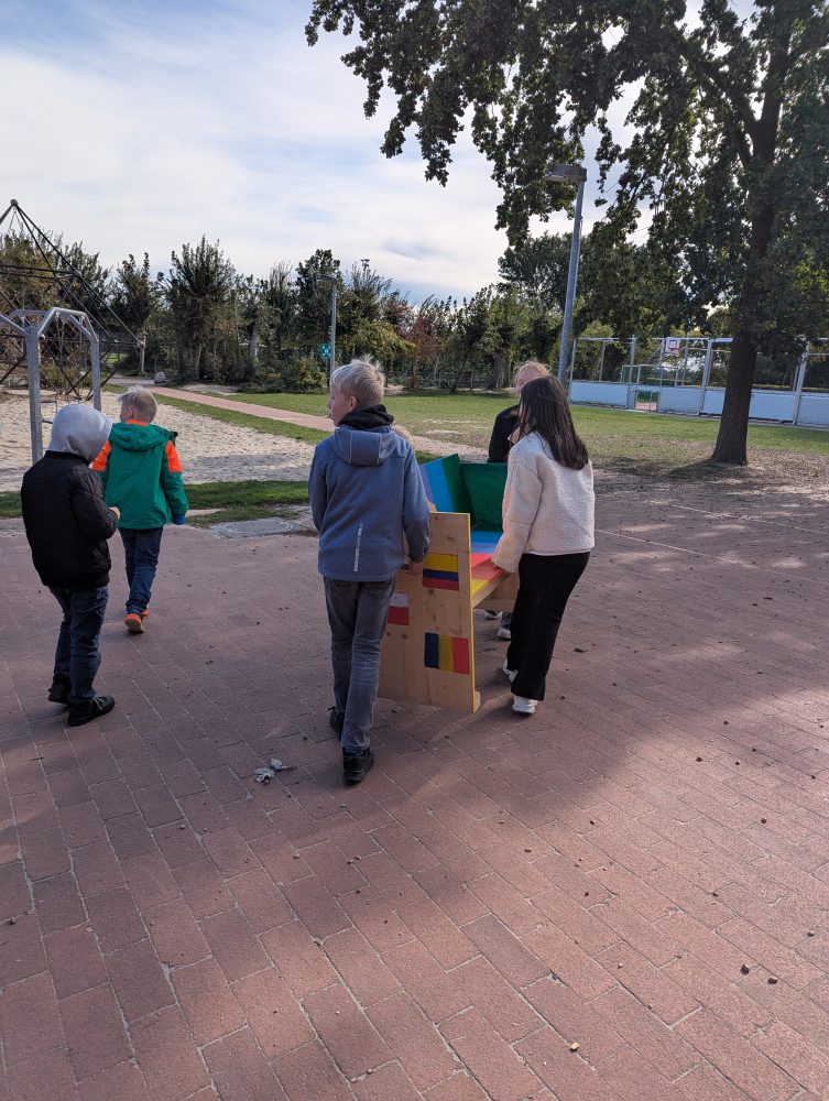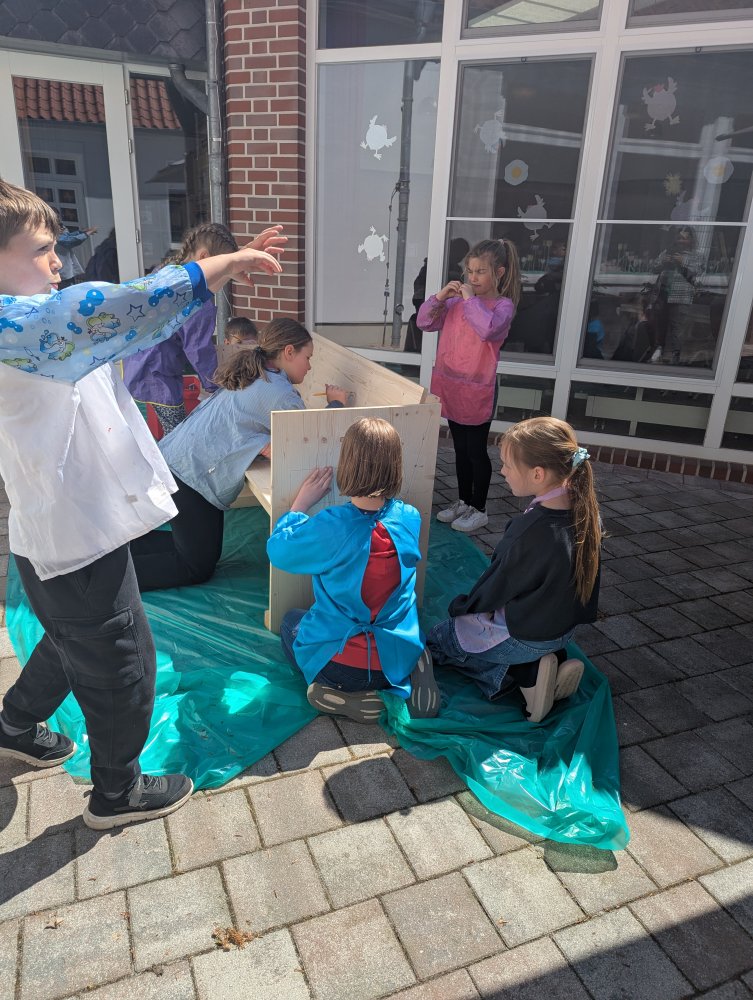 Im letzten Schuljahr bauten und gestalteten die Klassensprecher und Klassensprecherinnen gemeinsam eine „Mitspielbank“, die den Kindern auf dem Schulhof einen Ort der Begegnung bieten soll. Wer sich auf die Bank setzt, signalisiert, dass er oder sie einen Spielepartner*in sucht. So können die anderen Kinder das direkt sehen und auf das Kind, das alleine ist, zukommen. Dies soll Ausgrenzung und Einsamkeit vorbeugen und den Kindern die Möglichkeit bieten aufeinander zu achten und offen für neue Spielepartner*innen zu sein.